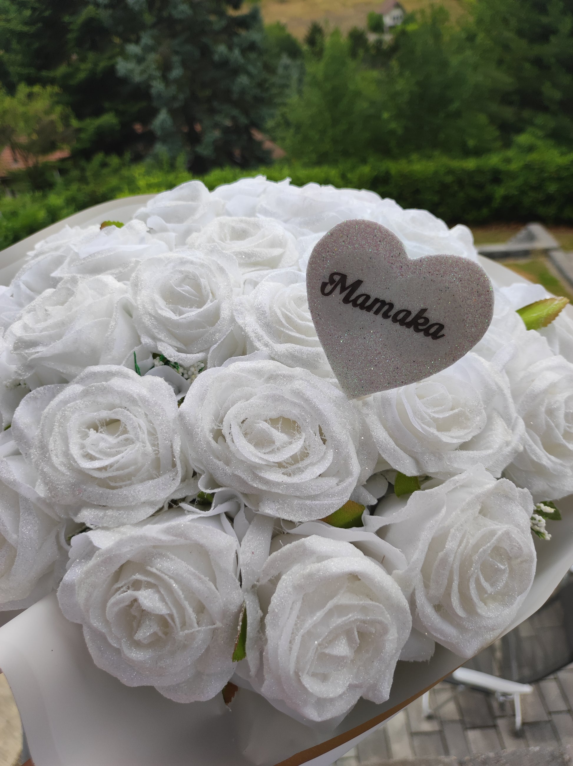 Ez a csokor egy WOW -élmény, amit minden nő imádni fog. A csillám rózsák nem hervadnak el, nem unalmasak, és garantáltan lenyűgözik. Olyan, mint az érzéseid – örök és ragyogó.