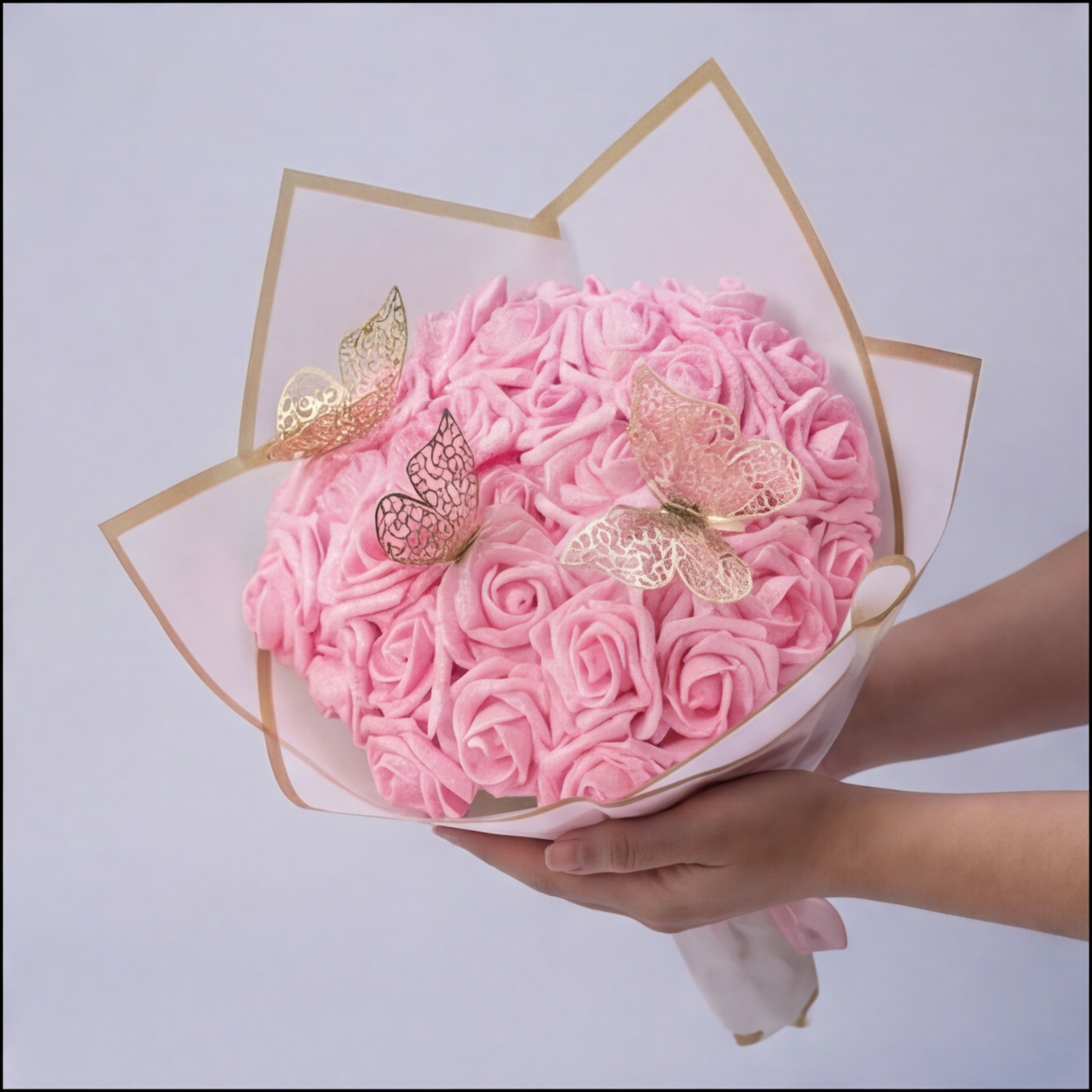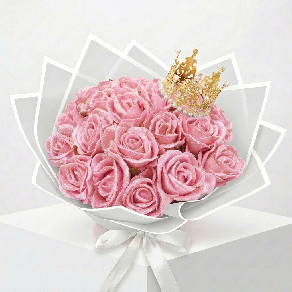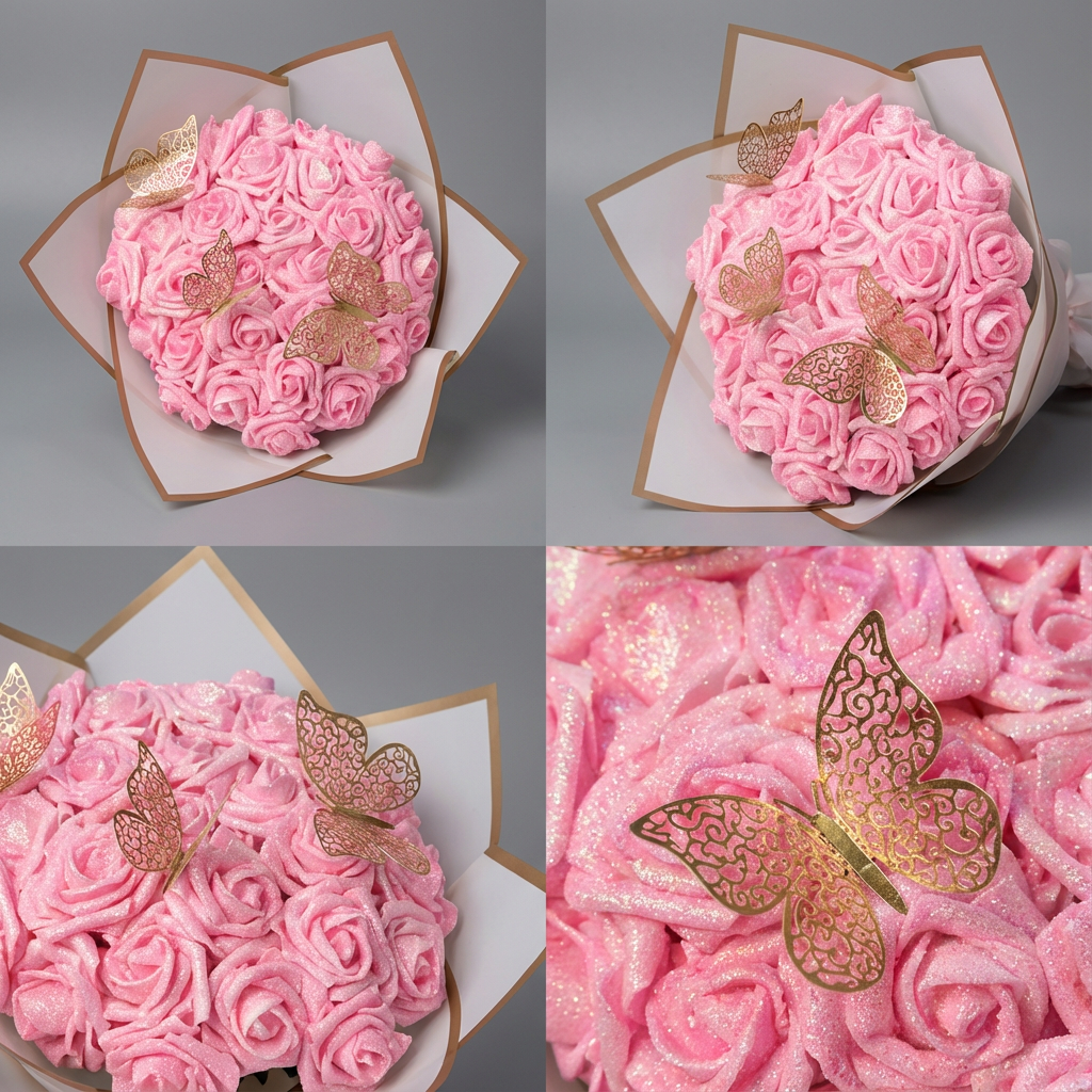 Ez a csokor egy WOW -élmény, amit minden nő imádni fog. A csillám rózsák nem hervadnak el, nem unalmasak, és garantáltan lenyűgözik. Olyan, mint az érzéseid – örök és ragyogó.